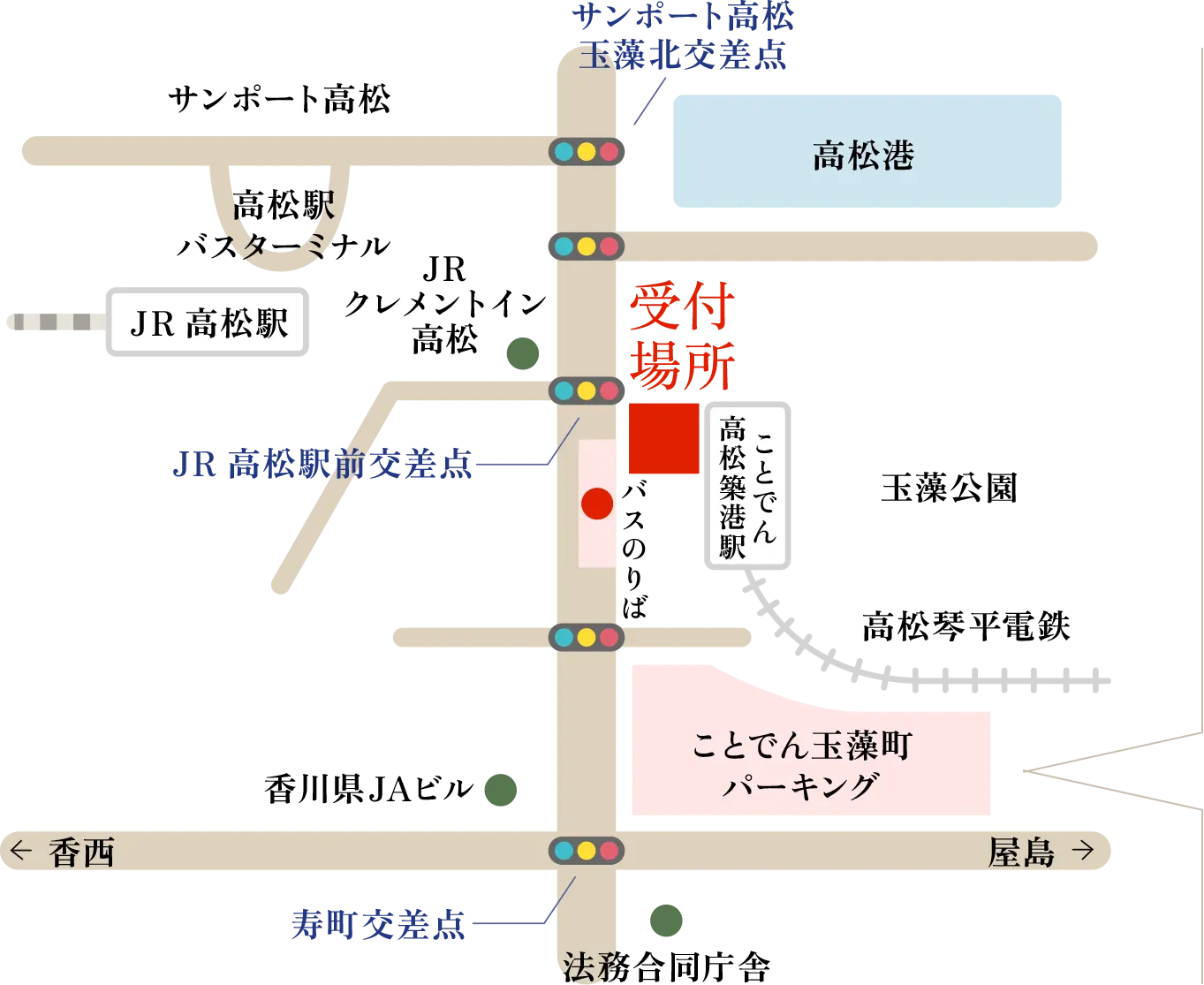 お車でお越しのお客様は、ことでん玉藻町パーキングが1日1,000円でご利用いただけます。チケットをお渡ししますので、当日受付にて駐車の旨をお申し出下さい。